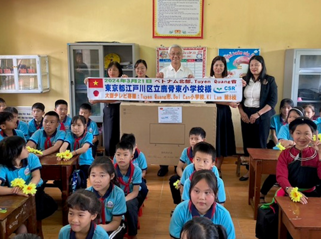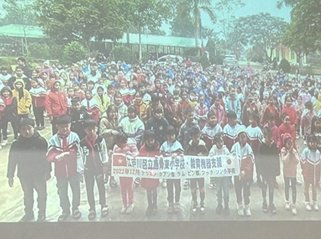 NPO法人CSRスクエアーの宍戸代表による講演を通じて、ベトナムやラオスの子どもたちが、厳しい生活の中でも、瞳を輝かせて学ぶ姿を知った子どもたちは、「人の役に立ちたい!」という思いから、SDGs募金活動を主体的に始め、約2週間にわたり取り組んだ。その結果、43,428円が集まり、宍戸先生を通じてベトナムの子どもたちに大型テレビを寄贈した。オンライン交流では、現地の子どもたちから感謝の言葉が届けられ、支援の達成感とともに、自己肯定感や他者への思いやりを育む貴重な経験となっている。