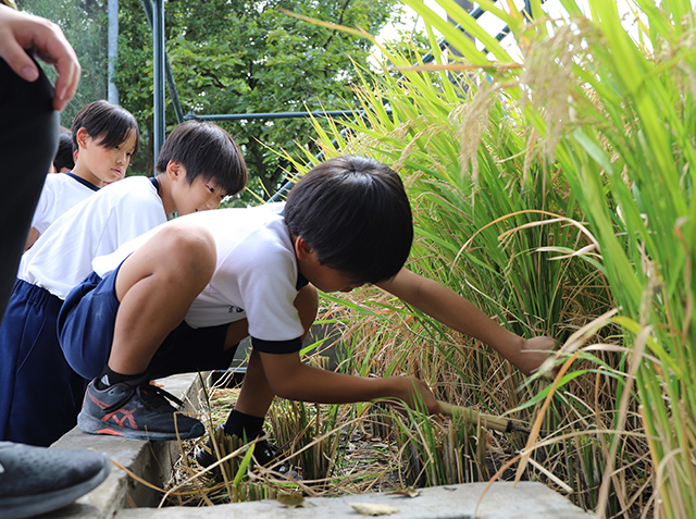 5年生は、資源を無駄なく活かす学びとして「米プロジェクト」に取り組んでいる。江戸川区の姉妹都市である山形県鶴岡市から、毎年苗を譲り受け、校内の田んぼで児童たちが自ら田植えを行うことからはじまる。秋には収穫した米を脱穀・精米し、家庭科の授業では、お鍋で炊いたごはんと味噌汁を自分たちで調理して味わう。こうした体験を通じて、食の大切さや自然の恵みへの感謝の気持を育んでいる。この取り組みは単なる農業体験にとどまらない。児童は、ふるさと学習で「しめ縄づくり」も体験する。収穫後の稲わらの一部をしめ縄づくりに活用し、地域文化への理解を深める学びにもつながっている。米づくりからしめ縄づくりまで、資源を余すことなく活用するこのプロジェクトを通して、児童たちは循環型社会の仕組みや暮らしの知恵について、楽しく実践的に学んでいる。