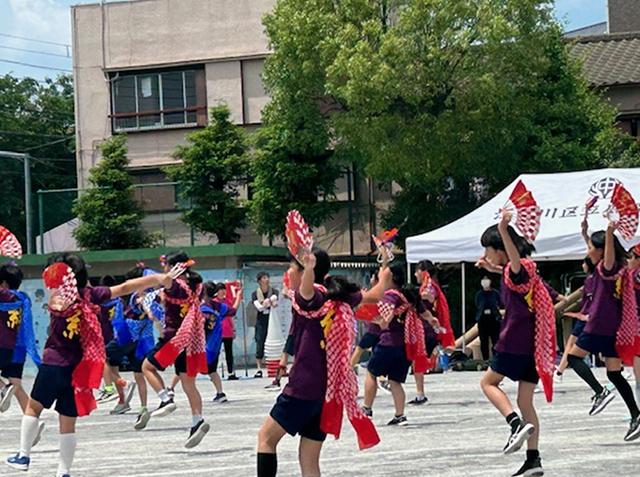 御神楽とは、もともと宮中で神に捧げる神楽の儀式のことで、鹿骨地域では、五穀豊穣を祈る大切な行事として長く受け継がれてきた。鹿骨東小学校では、この伝統文化を学びに取り入れ、44年間にわたり、継承活動を続けている。4年生は、地元の江戸扇子職人・松井宏さん指導のもと、御神楽で使用される「江戸扇子」づくりに挑戦。職人技に触れながら、ものづくりの楽しさと地域文化の奥深さを体感する。5年生になると、自作の扇子を手に、運動会で御神楽を披露。6年生から踊りを教わりながら、舞の技を磨いていく。6年生はその技をさらに極め、下級生の憧れの存在となっている。こうした学びを通して、子どもたちは地域の人々と触れ合いながら、御神楽の技や心を受け継いでいく。鹿骨東小学校の取り組みは、文化の灯を未来へとつなぐ、地域と子どもたちのかけがえのない歩みである。